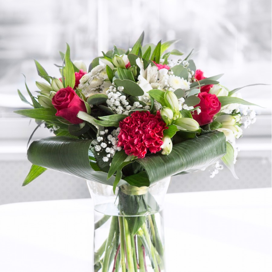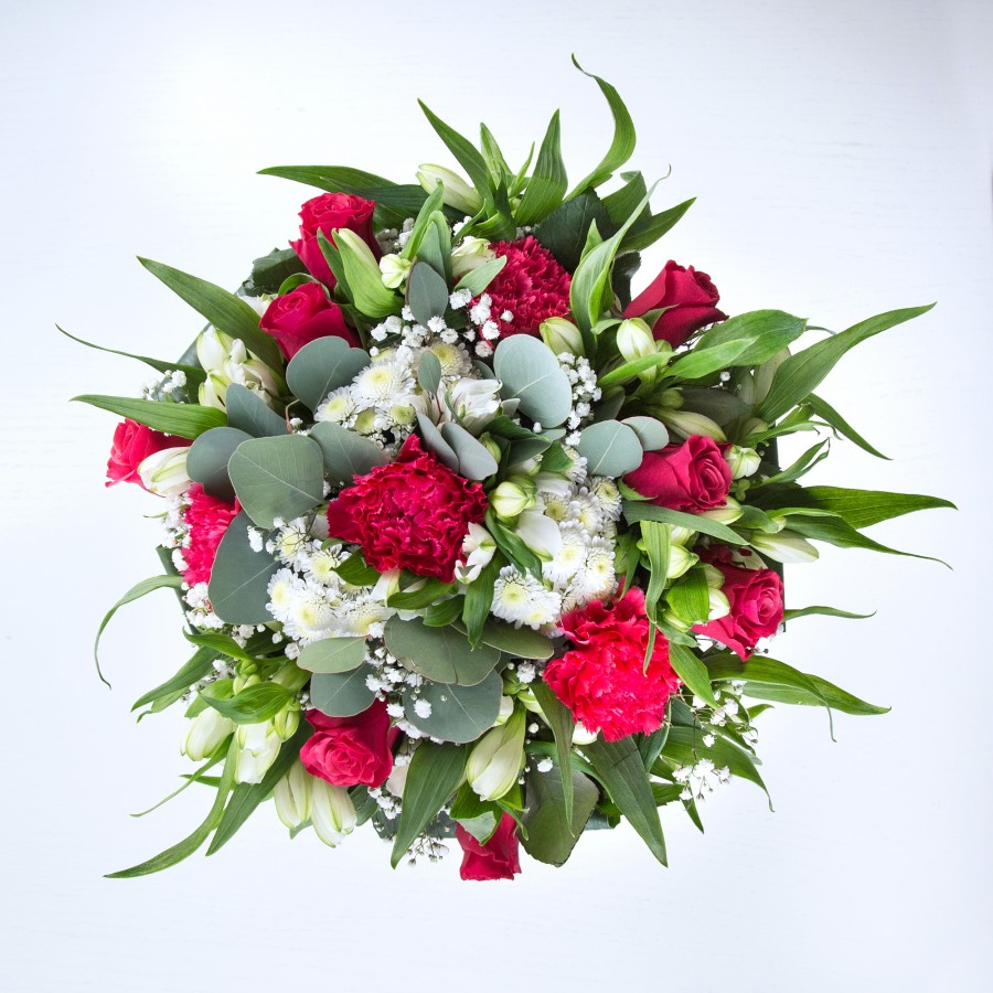 Experience the timeless beauty of our Pure Elegance Bouquet. This exquisite arrangement combines white chrysanthemums and alstroemeria with the deep allure of red roses and carnations, accented by delicate gypsophila and lush aspidistra leaves.